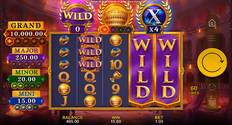 In terms of its base structure, arena of gold: shields of glory is a 5-reel video slot with 4 rows and 40 paylines. When the free spins feature begins the number of paylines can expand to 60 paylines, which adds to the feeling that the bonus round is not just a reskin of the base game but a better version of it.