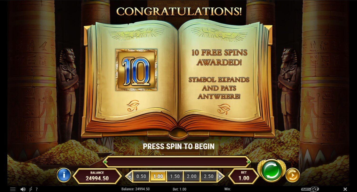 At a glance, Book of Dead Go Collect is a 5-reel, 3-row video slot with 10 paylines. As such, it is built in HTML5 and therefore will run well on desktop and mobile slot play. The interface is the clean Play’n GO style most users will be accustomed to. The base game maintains the “book” wild/scatter identity, and the bonus remains based upon free spins with expanding symbols. The addition of the Go Collect mechanic is what provides the unique twist to the bonus structure, providing a more structured approach to building wins.